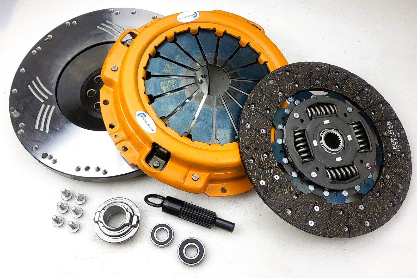 YOU WILL RECEIVE A CLUTCH KIT INCLUDING: BLUSTEELE SURVIVOR SERIES SGI COVER ASSEMBLY BLUSTEELE SS PREMIUM ORGANIC CLUTCH PLATE BILLET CHROMOLLY FLYWHEEL PREMIUM THRUST BEARING AND CARRIER ALIGNMENT TOOL SPIGOT BEARING