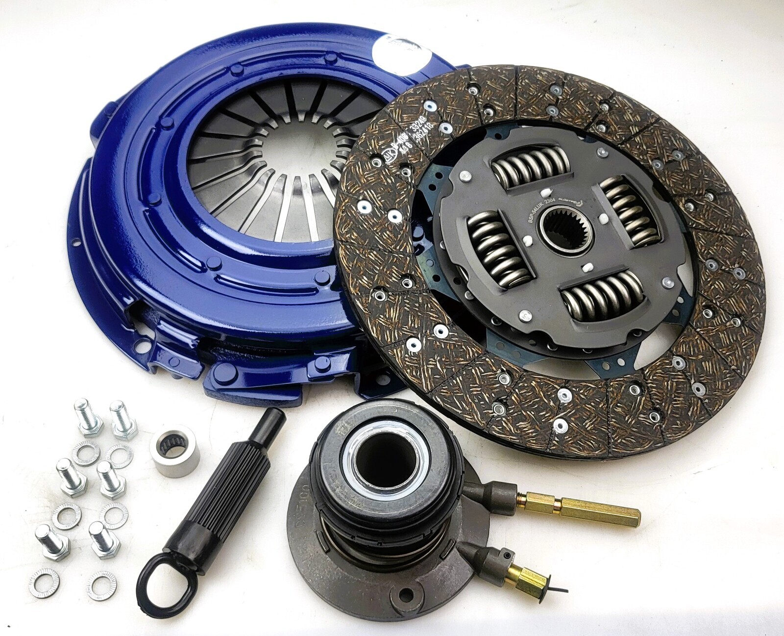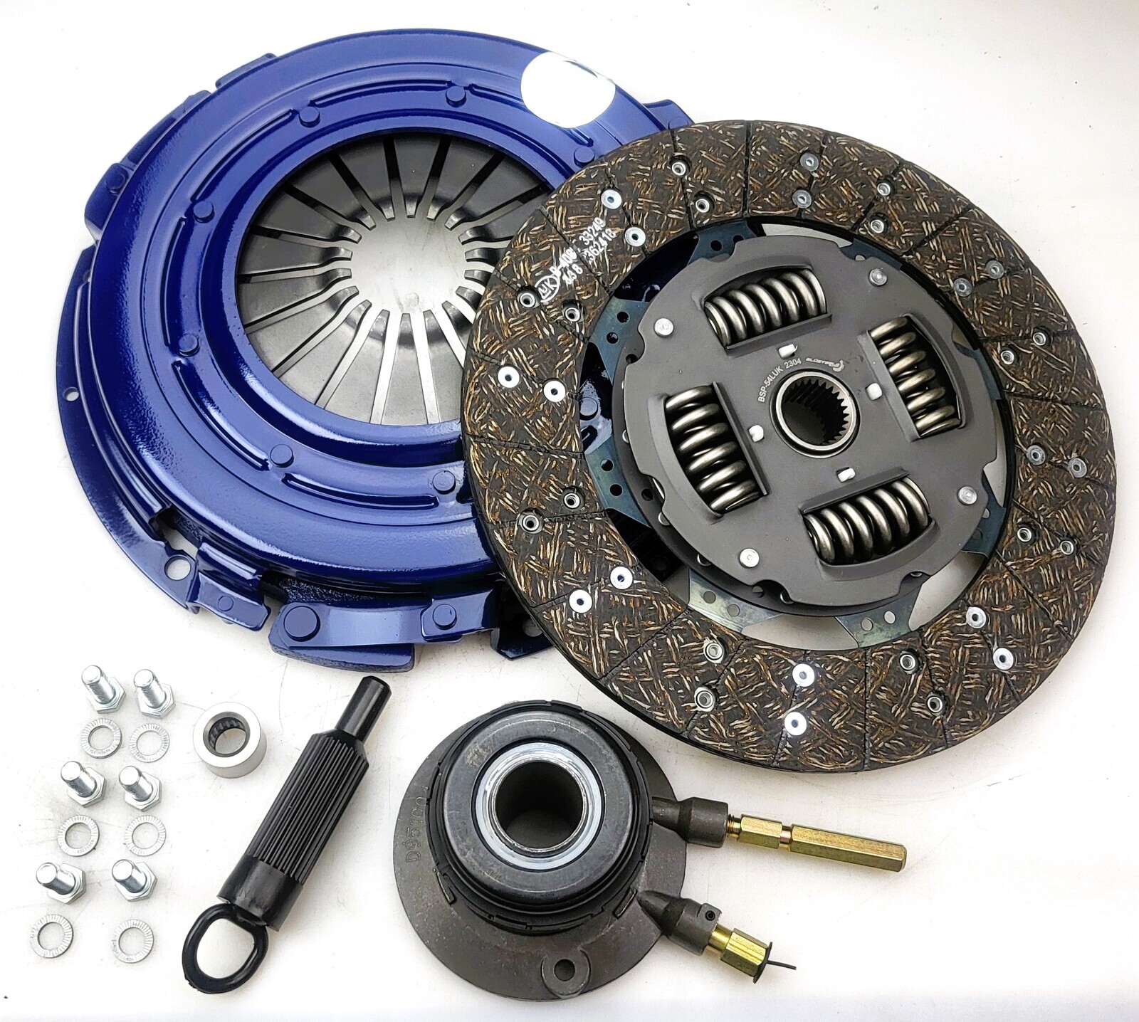CLUTCH KIT INCLUDES: HEAVY DUTY PRESSURE PLATE HEAVY DUTY ORGANIC FRICTION PLATE CONCENTRIC SLAVE CYLINDER SPIGOT BEARING ALIGNMENT TOOL